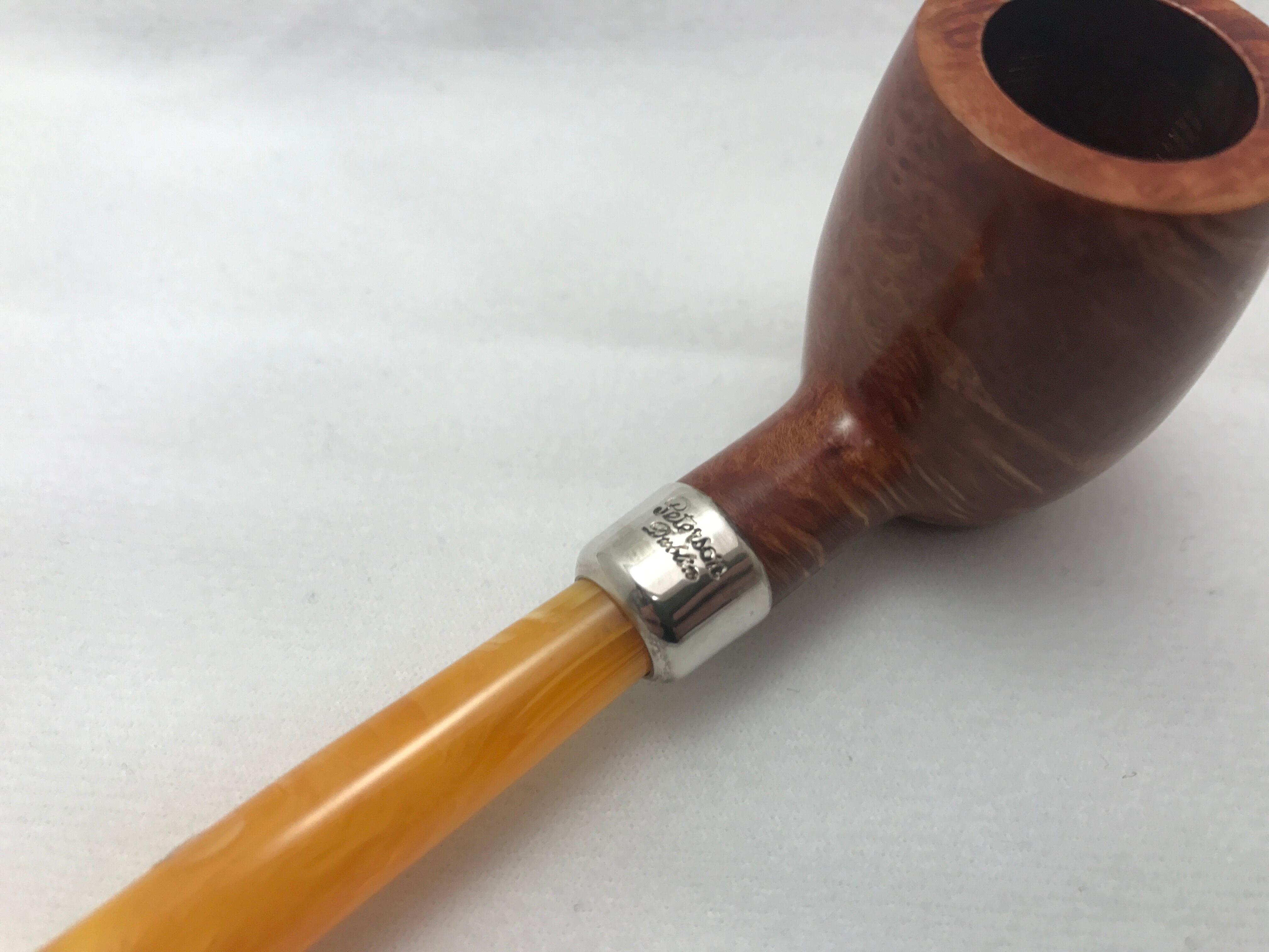 ピーターソンの柘カタログ外パイプ。マウントにスターリングシルバーを使用し、マウスピースはマーブルアクリル。持ち運びに便利な小ぶりサイズでありながら気品あるパイプ。