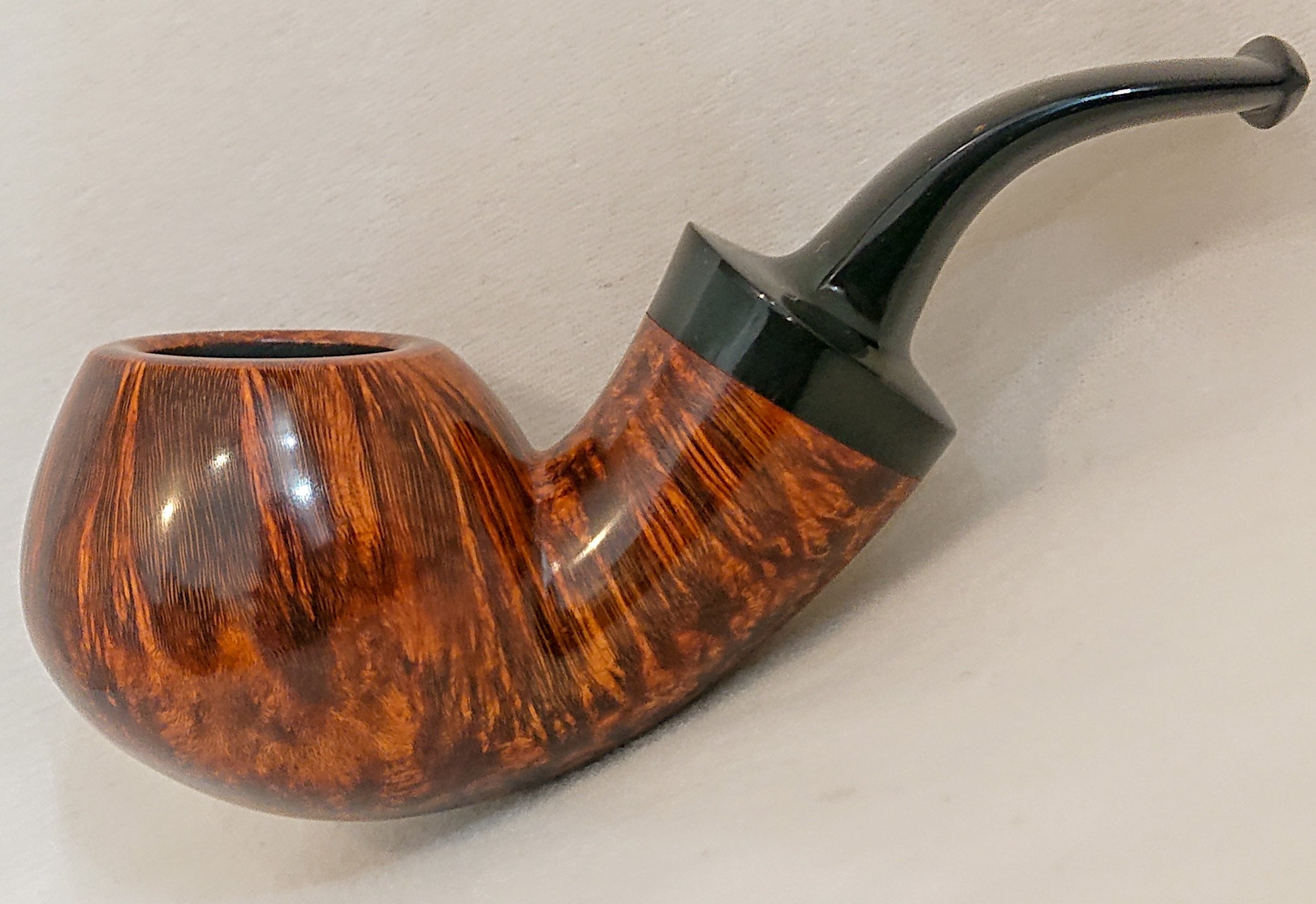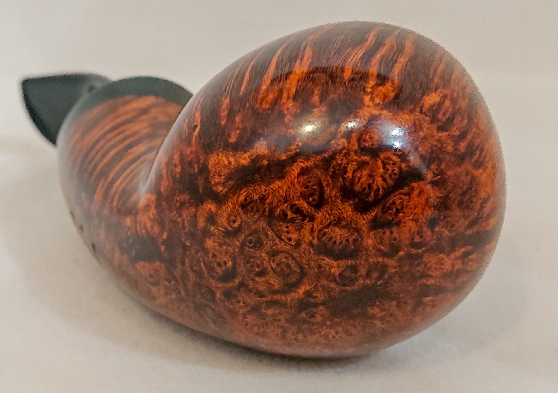 シェイプはややボウルが大きめのアップルベントでダークスムース仕上げ。ダークスムース仕上げにすることで、ボウルのグレインやボトムのバーズアイがより際立つ。このパイプの場合、ボトムのバーズアイの美しさをより強調するためではないかと考えられる。原木の状態を見極めながらシェイプや仕上げを決めることは熟練した職人でないと出来ない業です。