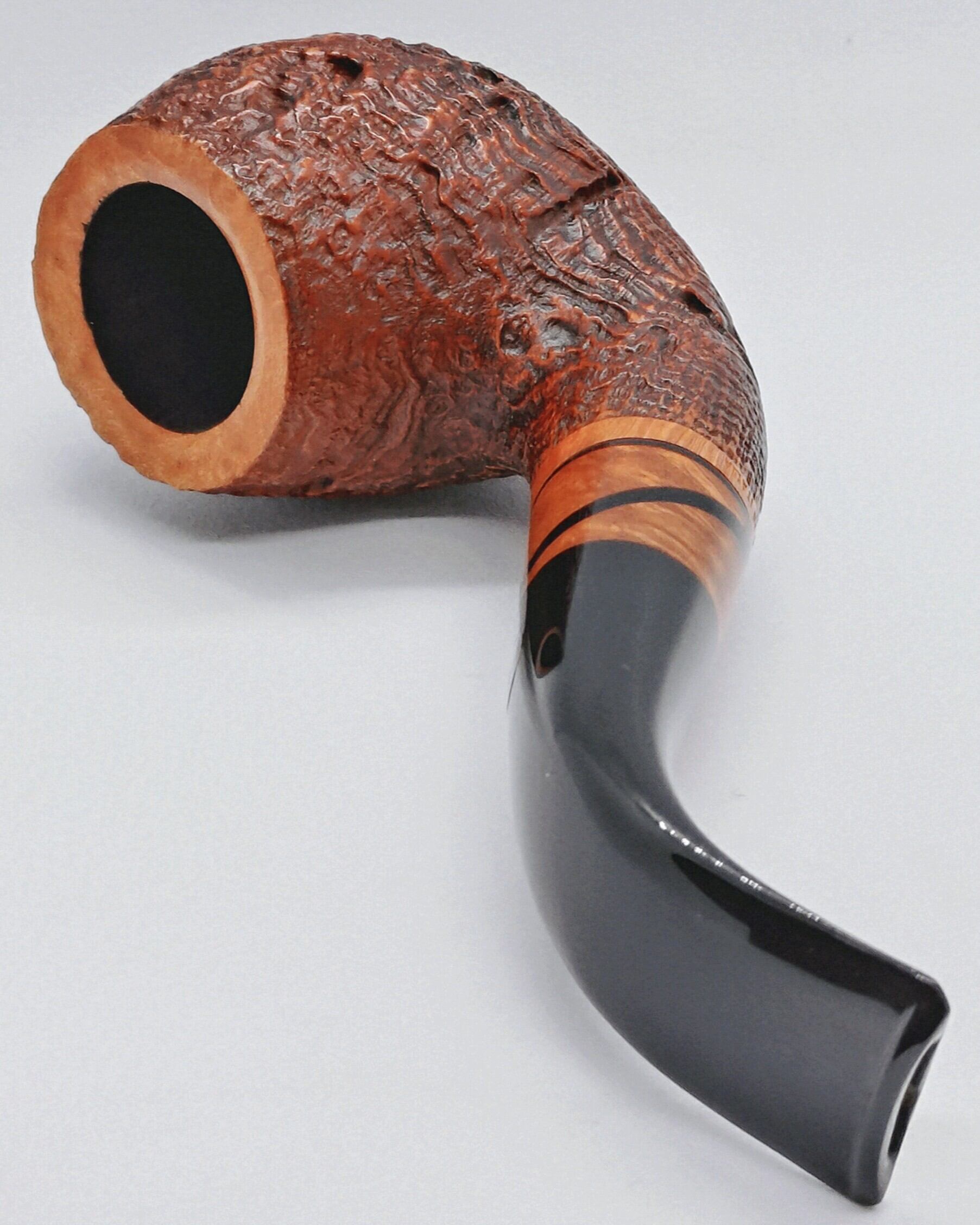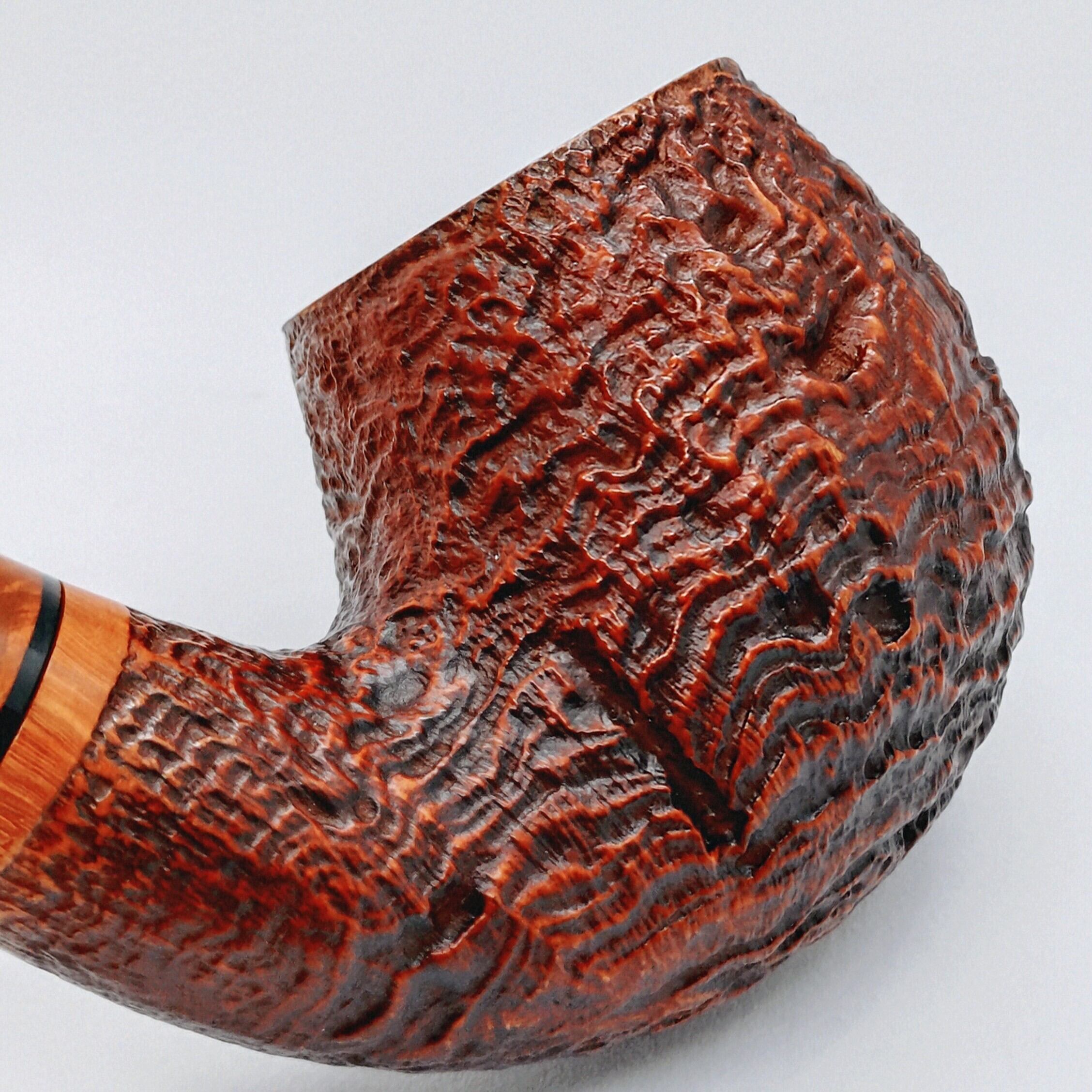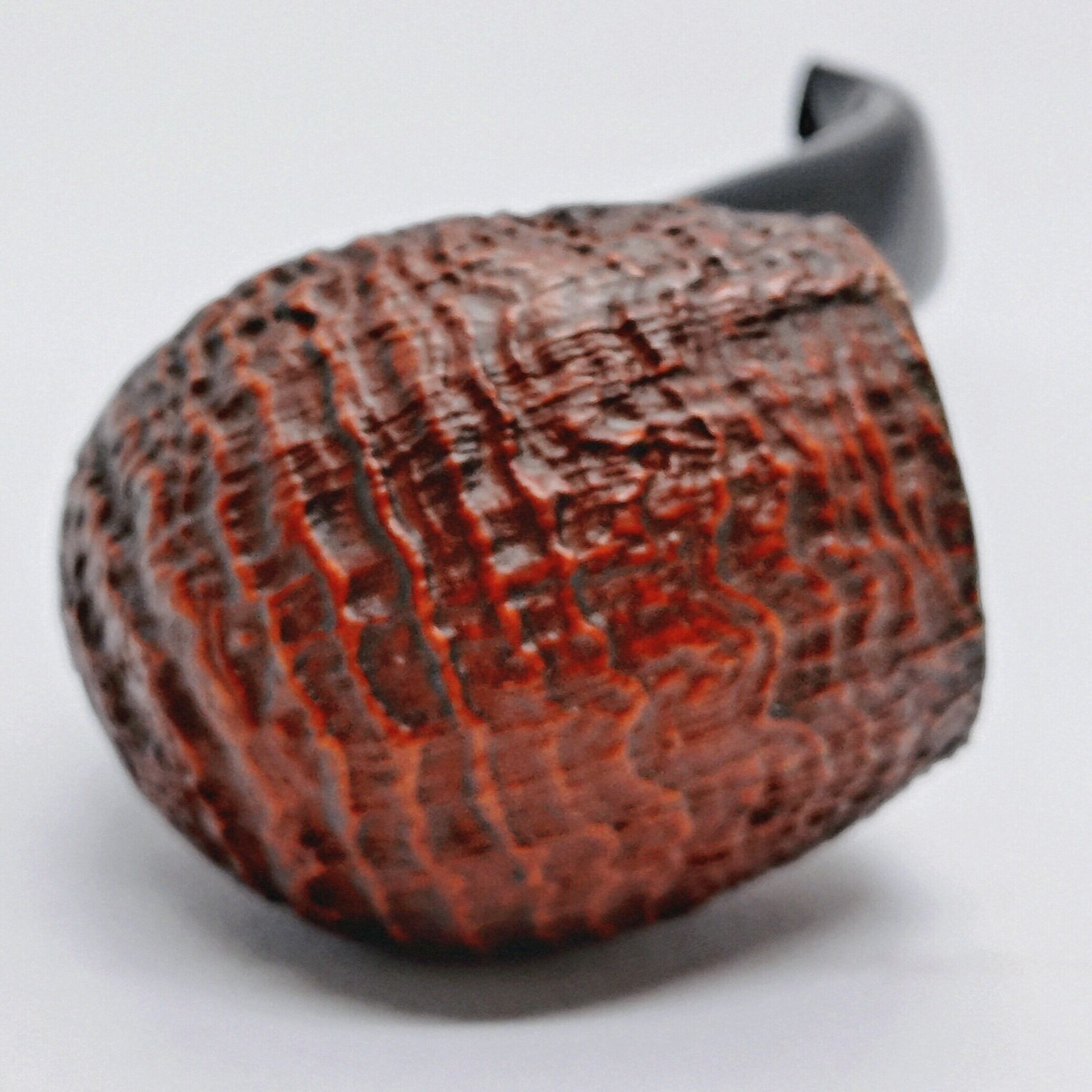 ボウルトップ、刻印がある箇所、マウスピースに埋め込まれたブライヤーにはライトな染料を用いられている。それにに対して、サンドブラスト加工を施したところには、赤みがかった茶色の染料が使用されている。