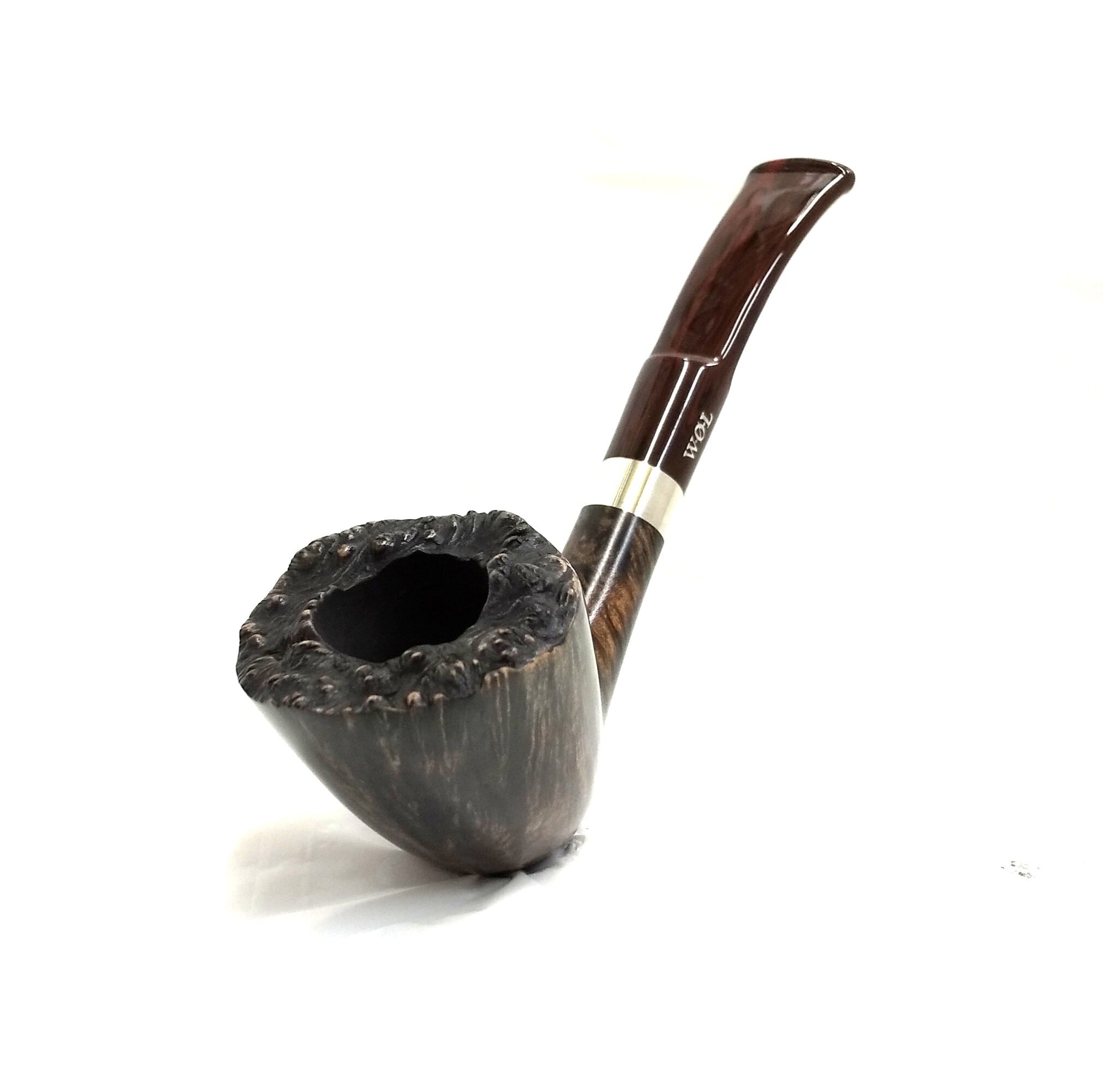 ダークな仕上げにすることで、フレームグレインのコントラストが際立つ。明るいハイライトな部分はブラウンがかったグレー、ローライトな部分はブラック。このボウルのフレームグレインは、落ち着きのある印象を与えてくれる。見るアングルによって異なるその雰囲気に思わず「魅せられる」。リングはスターリングシルバー製、マウスピースは変色の心配がないマーブル模様のアクリル製なのでパイプの細部にまでこだわっている。