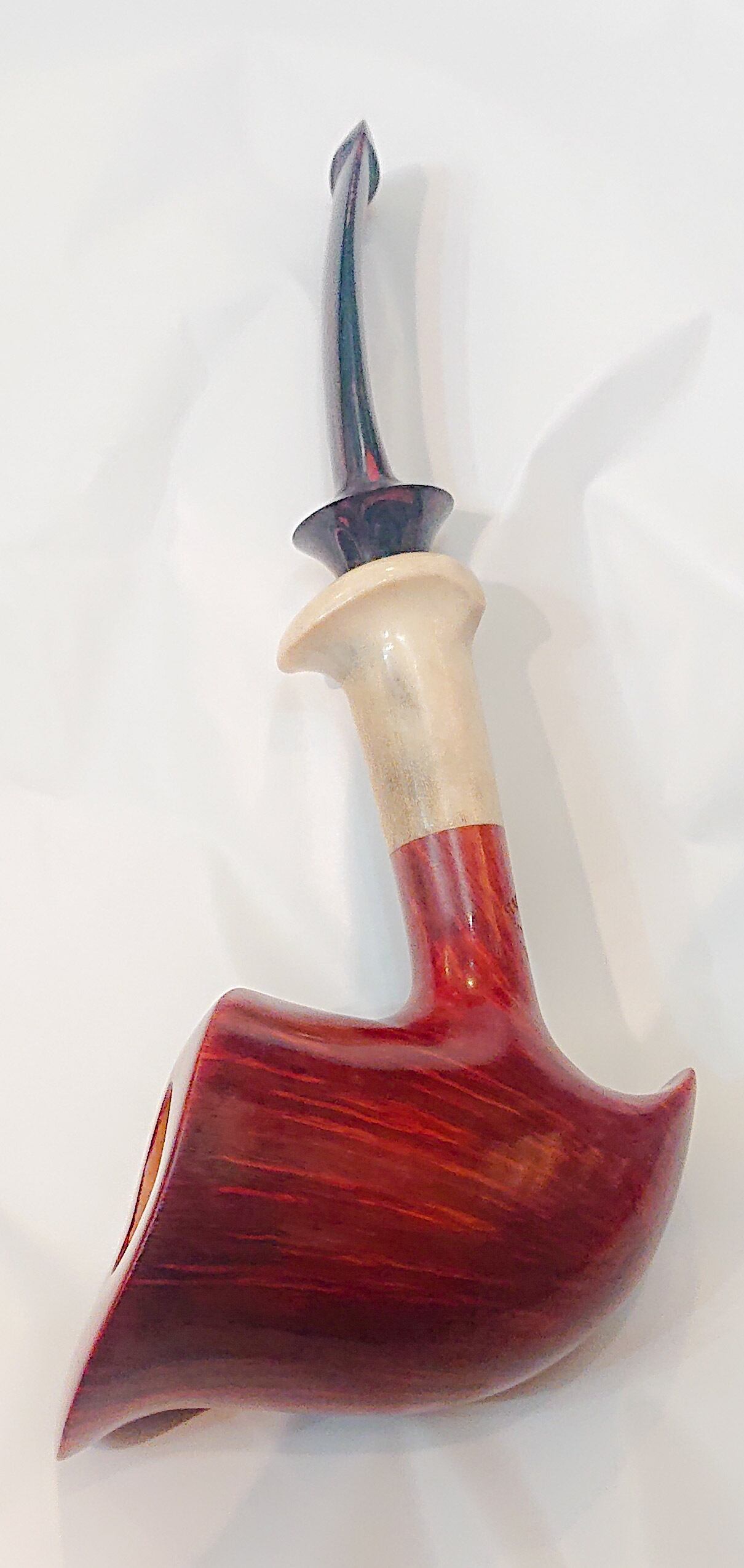 二段ダボにマーブルのエボナイト、水牛のマウントに赤みがかったブラウンのスムース仕上げ。細部にわたりこだわりを感じられます。シェイプはPickaxe(つるはし形)の変形とも言うべきユニークなものです。特に、ボウルトップの緩やかな曲面、ボトムのポインテッド風な見た目、それらを繋ぐかの様なストレートグレインが見所です。